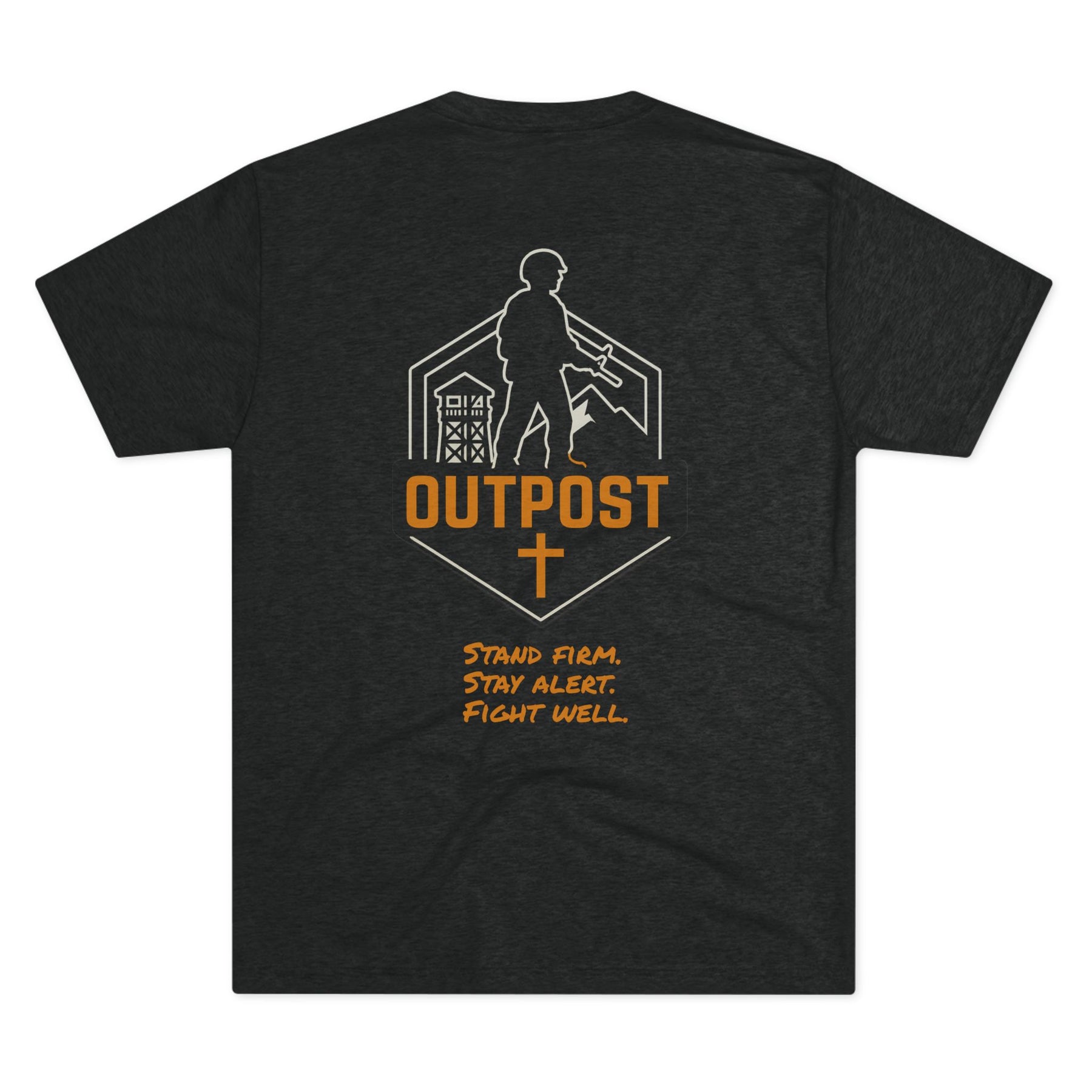 Stand Firm. Stay Alert. Fight Well. (These run a size small) Inspired by strength, vigilance, and unwavering mission, the Outpost 443 Graphic Tee is more than just apparel—it’s a call to action. Whether you're holding the line for your brothers, standing watch over your community, or walking in quiet obedience to your purpose, this shirt is built to represent those values.